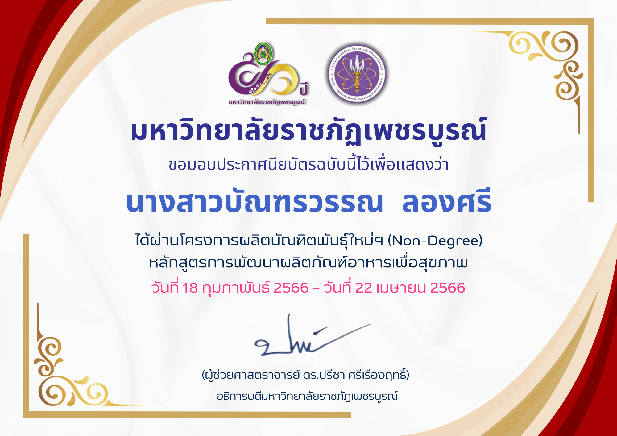 | 16 | นางสาวบัณฑรวรรณ ลองศรี | 9 | ดาวน์โหลดประกาศนียบัตร |